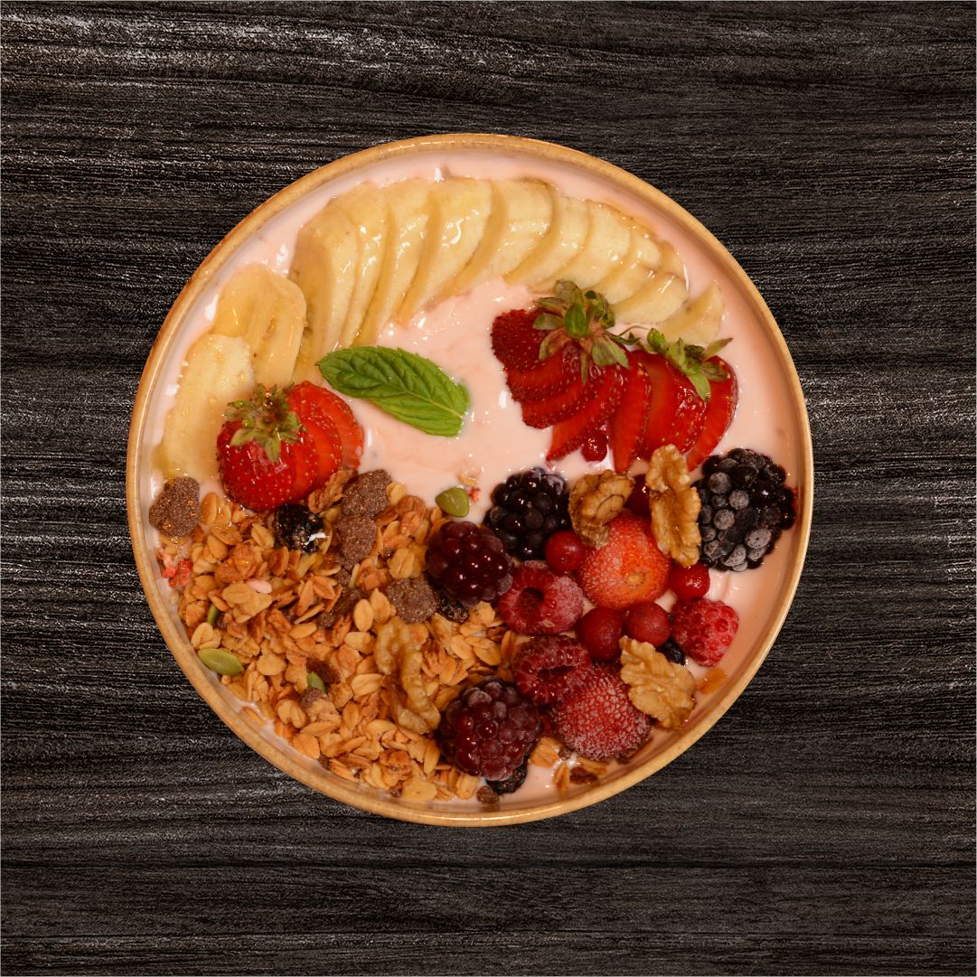 Granola yoğurdu, granola, mevsim meyveleri ve kuruyemiş ile servis edilir.