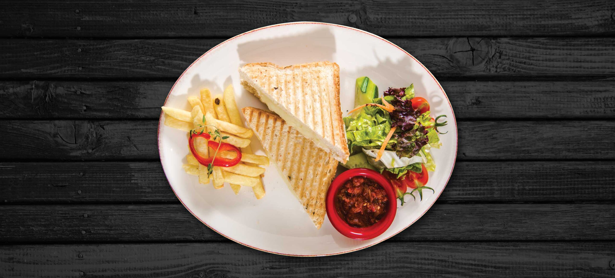 İki adet tost ekmeği içerisinde çift dilim kaşar peyniri, akdeniz yeşillikleri, bonfirit patates ve ezme sos ile servis edilir.