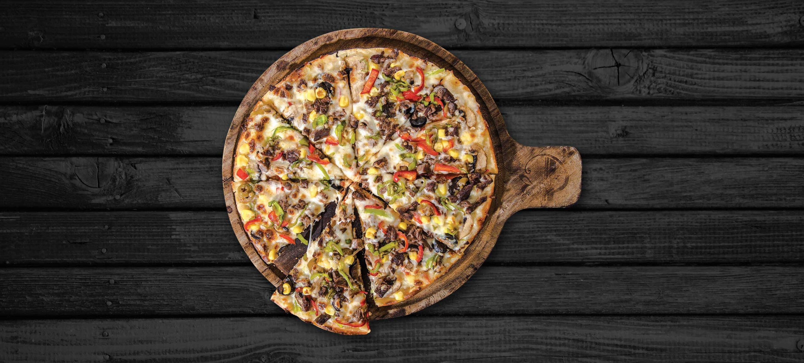 Küp doğranmış bonfile dilimleri, mozzarella peyniri, mantar, renkli biberler, zeytin ve mısır ile servis edilir.