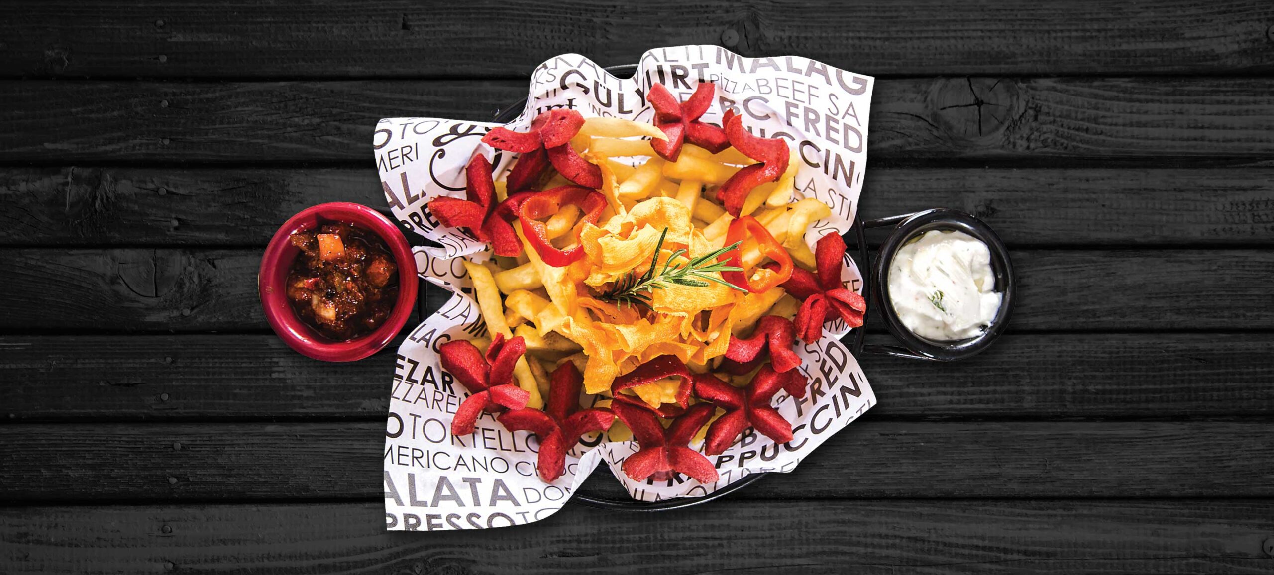 Kızarmış yıldız sosisler, bonfrit patates, ezme ve roka dip sos ile servis edilir.